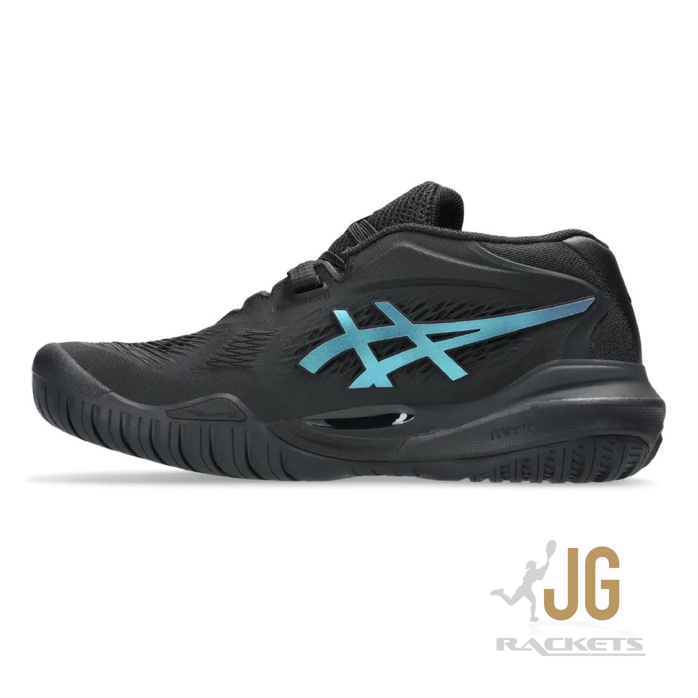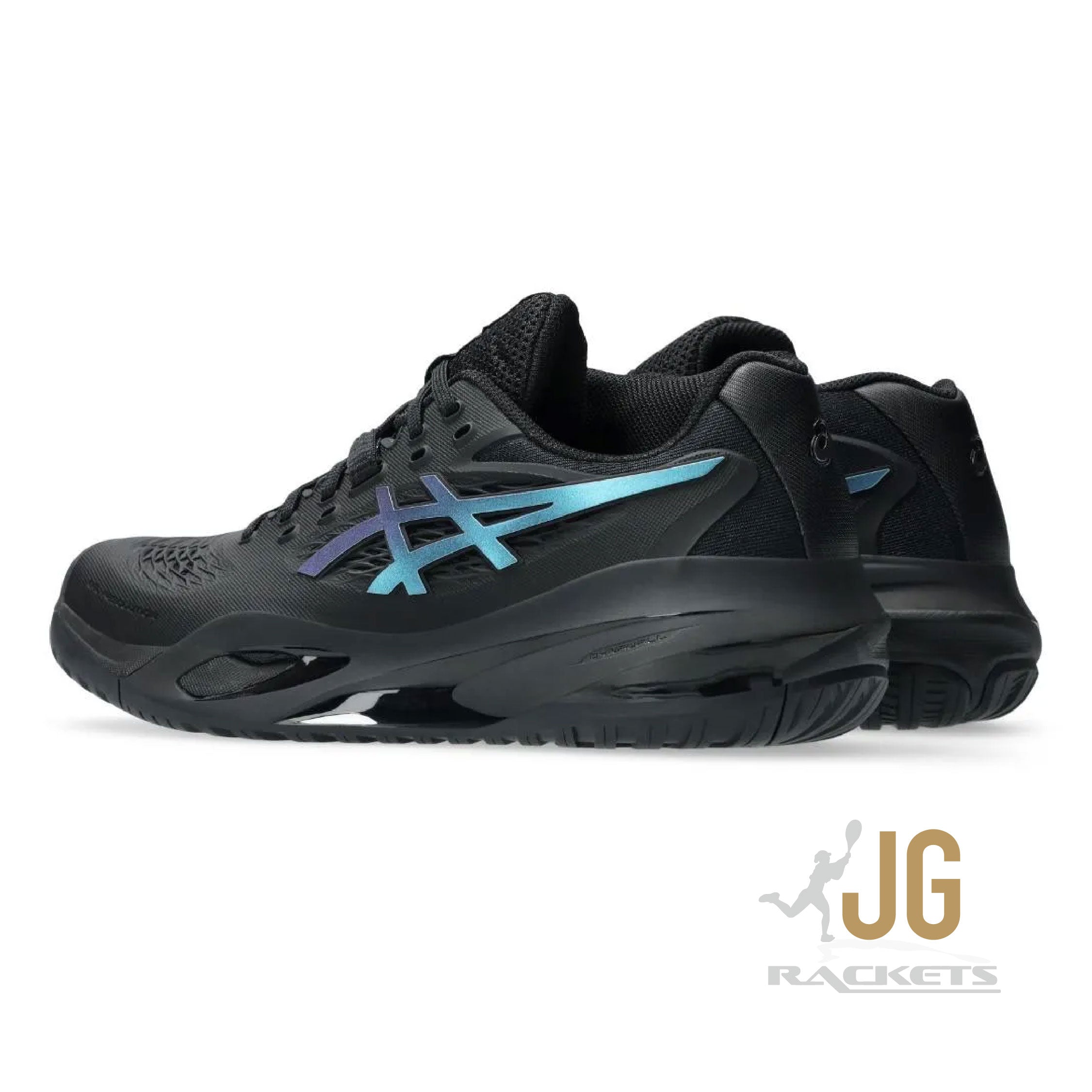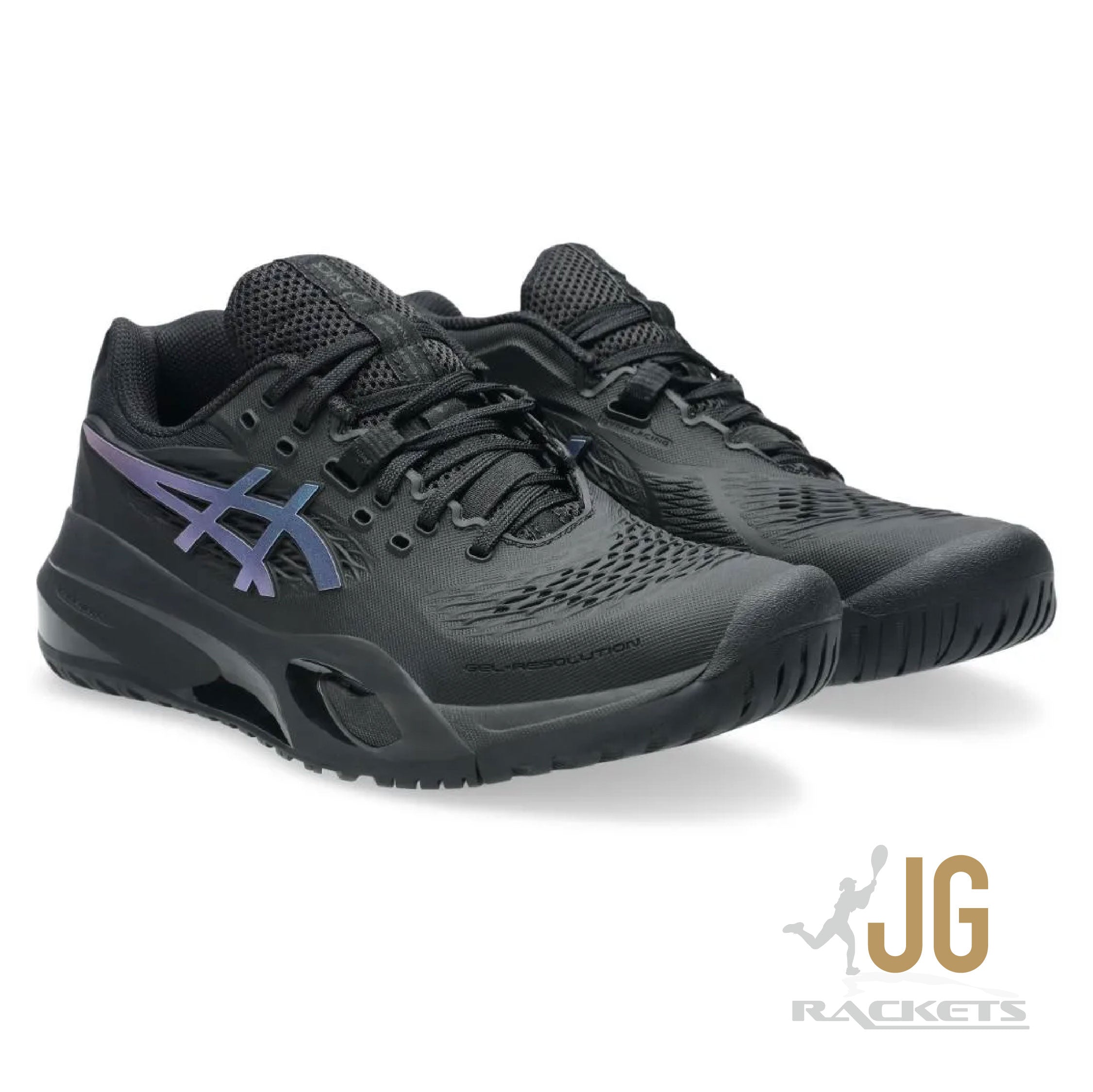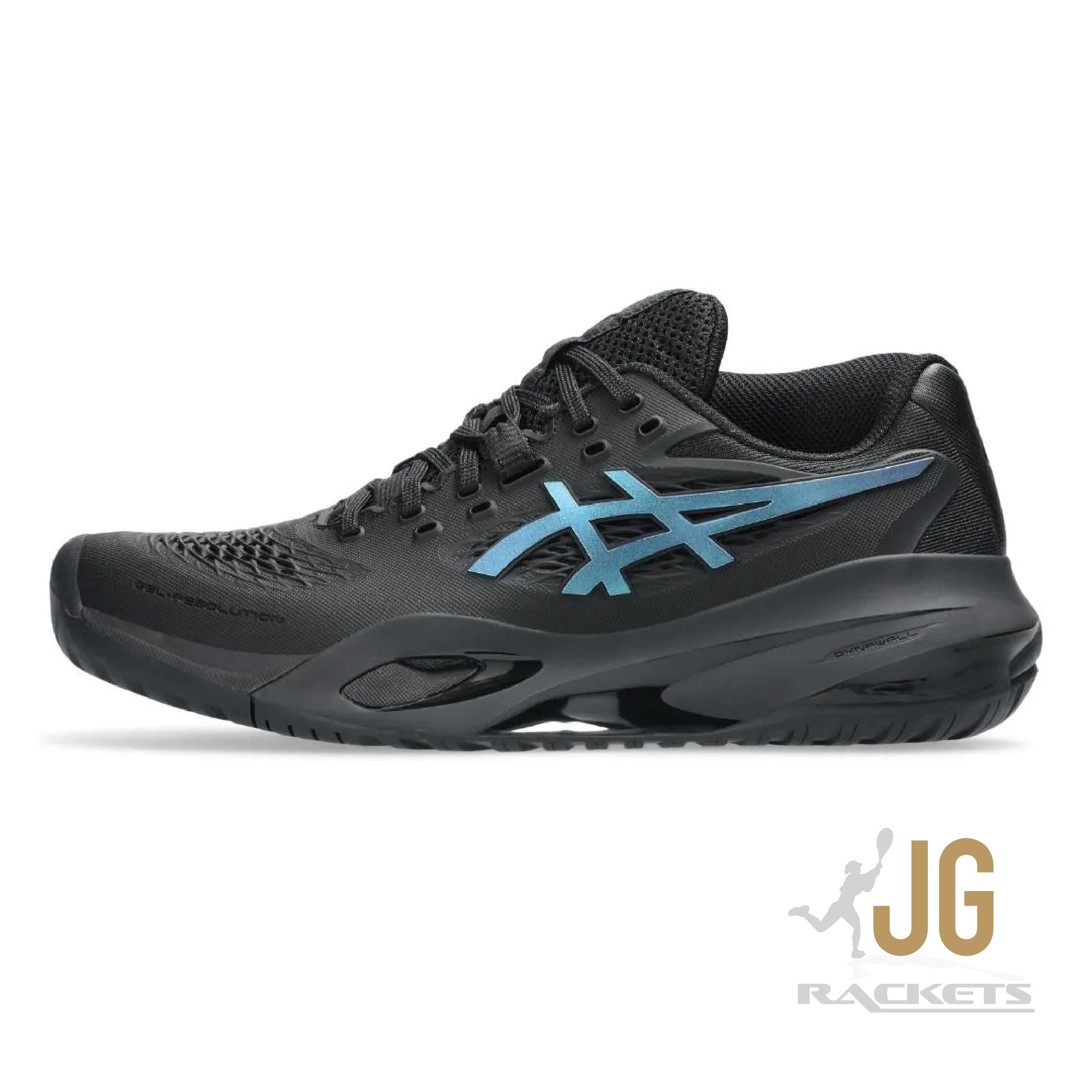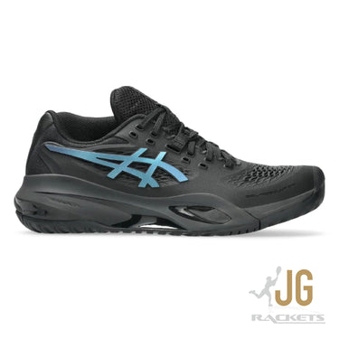 The GEL-RESOLUTION™ X NIGHT ENERGY tennis shoe creates advanced comfort for players who like to control the game from the baseline. It's rendered with a primarily black color palette that's offset with prism blue accents for contrast.