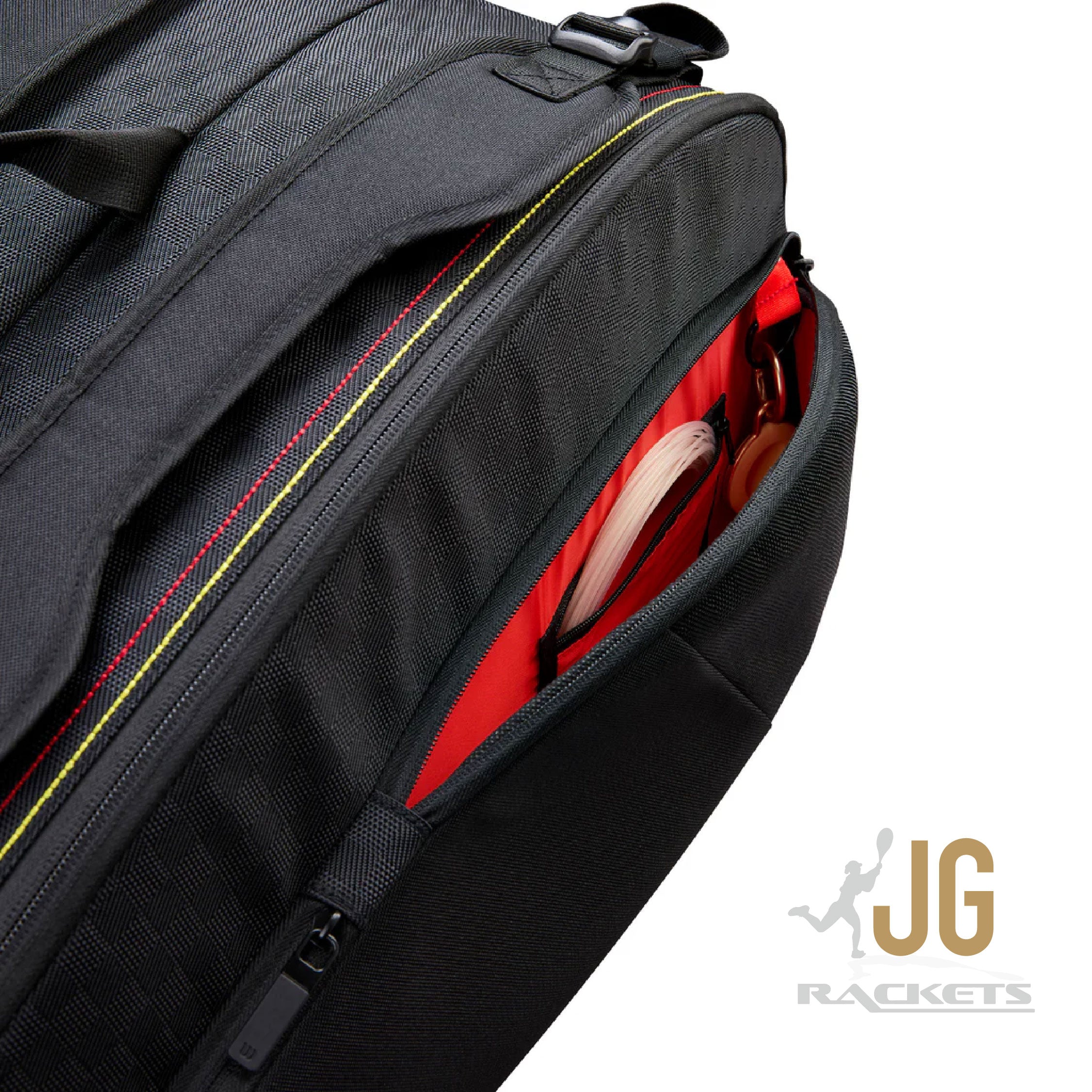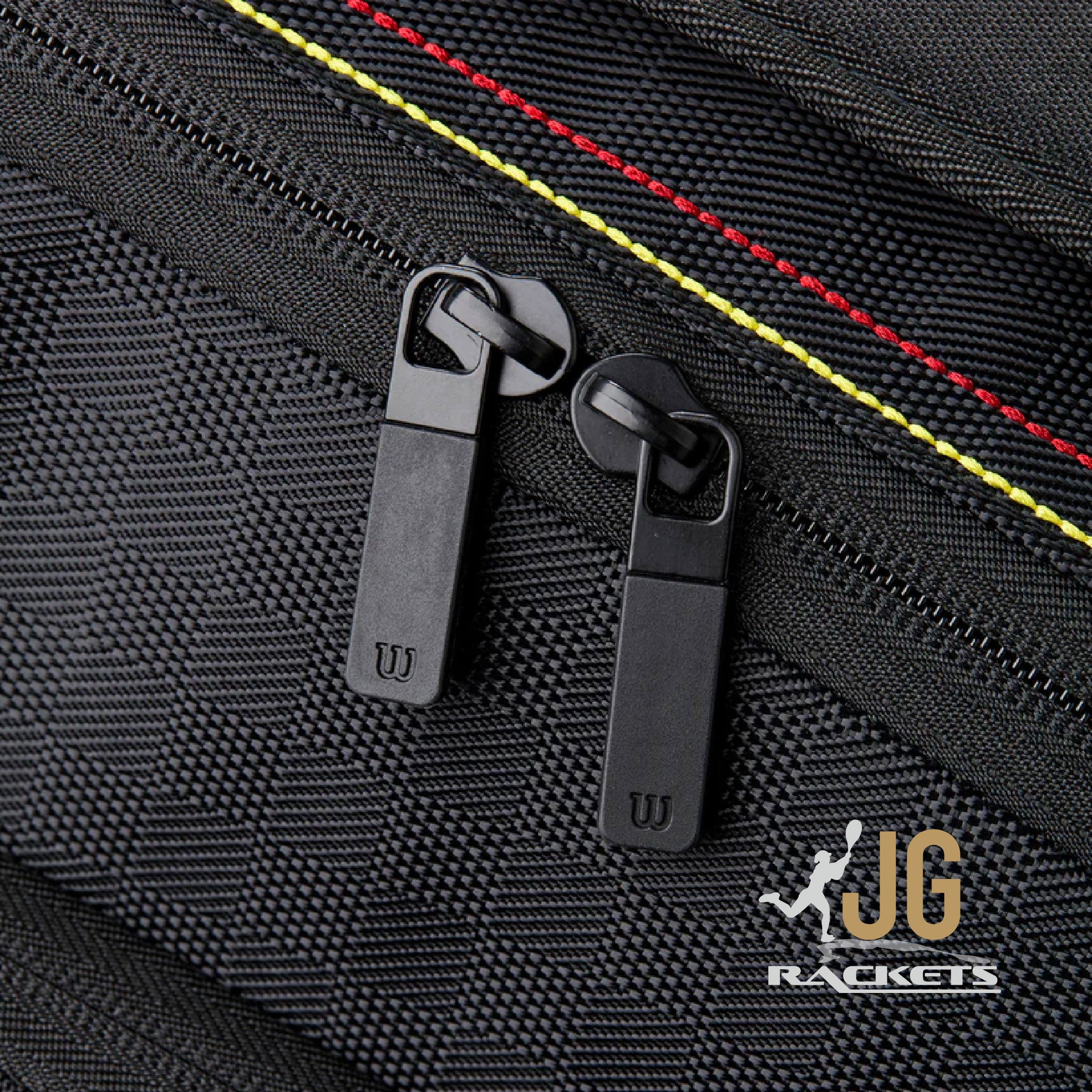 Equipping top tennis players for every match. This Wilson 12-pack racket bag has a design inspired by our most iconic racket franchise ever, the Pro Staff. It has two main compartments that can carry up to a dozen rackets, plus apparel, shoes and other tennis accessories. Two additional pockets on the outside hold smaller personal items and valuables. Carry by hand using the top grab handle or use the padded, adjustable shoulder straps.